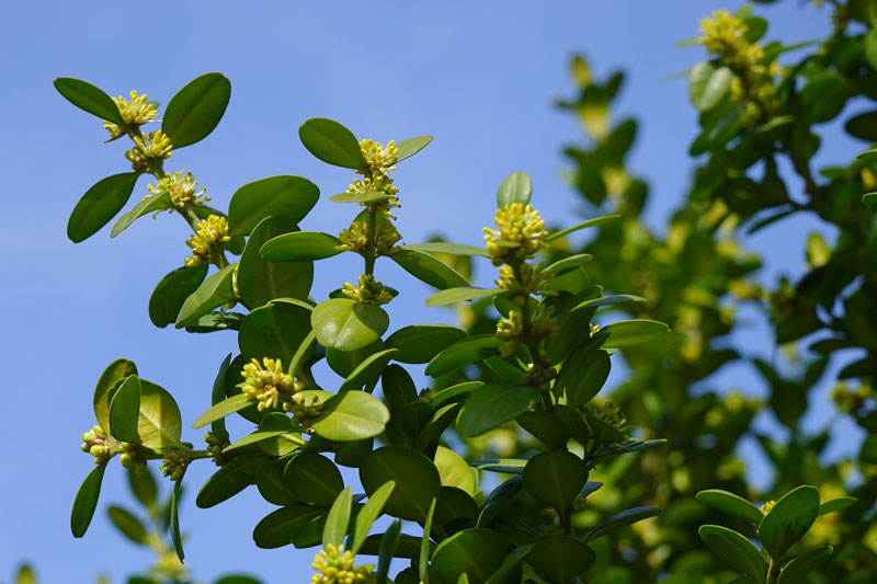 De petites grappes de fleurs jaunes font leur apparition de mars à mai à la base des feuilles.