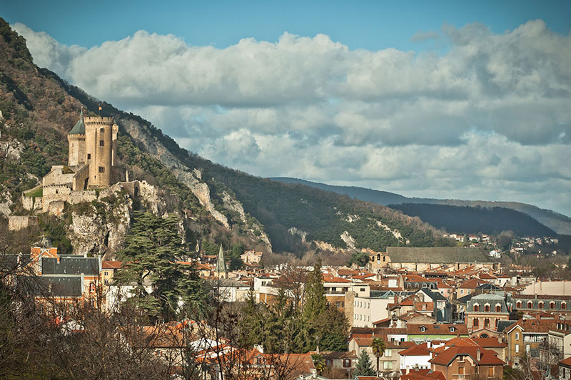 Foix, ville qui a une altitude comprise entre 358 et 933 mètres au dessus du niveau de la mer, se trouve au confluent des rivières Ariège et Arget dans les contreforts des Pyrénées, accessible en voiture depuis la Route Nationale 20 et à proximité des frontières de l'Espagne et d'Andorre.