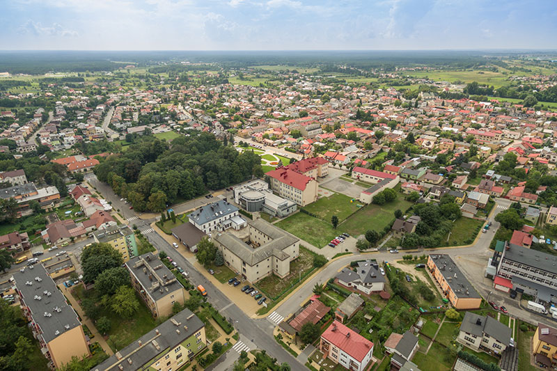 Le territoire s'étale sur 14,84 kilomètres carrés, pour une population de 12093 habitants, selon le recensement de l'année 2013. Varsovie, la capitale du pays, est à une distance, à vol d'oiseau, de 195 kilomètres de son centre géographique.