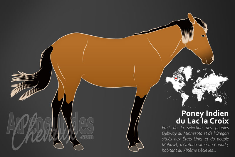 Fruit de la sélection des peuples Ojibway du Minnesota et de l'Oregon situés aux États Unis, et du peuple Mohawk, d'Ontario situé au Canada, habitant au XIXème siècle les rives du lac La Croix, d'où il tire son nom, le Poney Indien du Lac la Croix est probablement issu du croisement entre le Canadien et le Mustang Espagnol. Le modèle d'aujourd'hui est le résultat de la sélection naturelle de l'environnement parfois difficile dans lequel il est élevé.