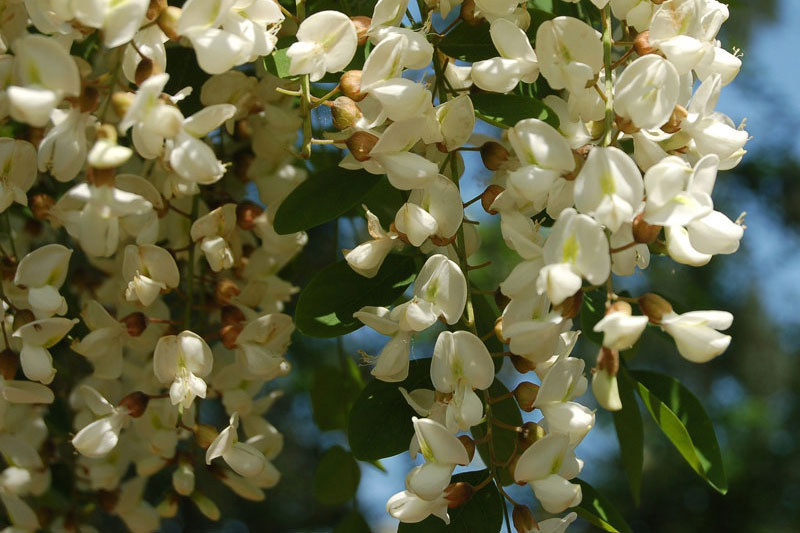 En grappes pendantes parfumées, les fleurs sont blanches et mellifères de 10 à 25 centimètres de long.