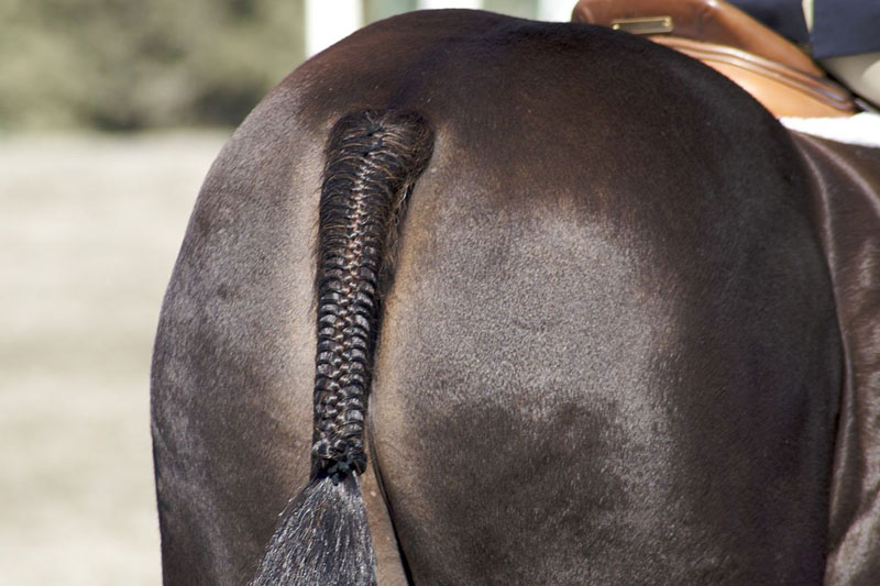 Par ailleurs, si la tresse est réalisée la veille, il est préférable d'utiliser une bande de queue pour éviter que le cheval ne l'abîme.